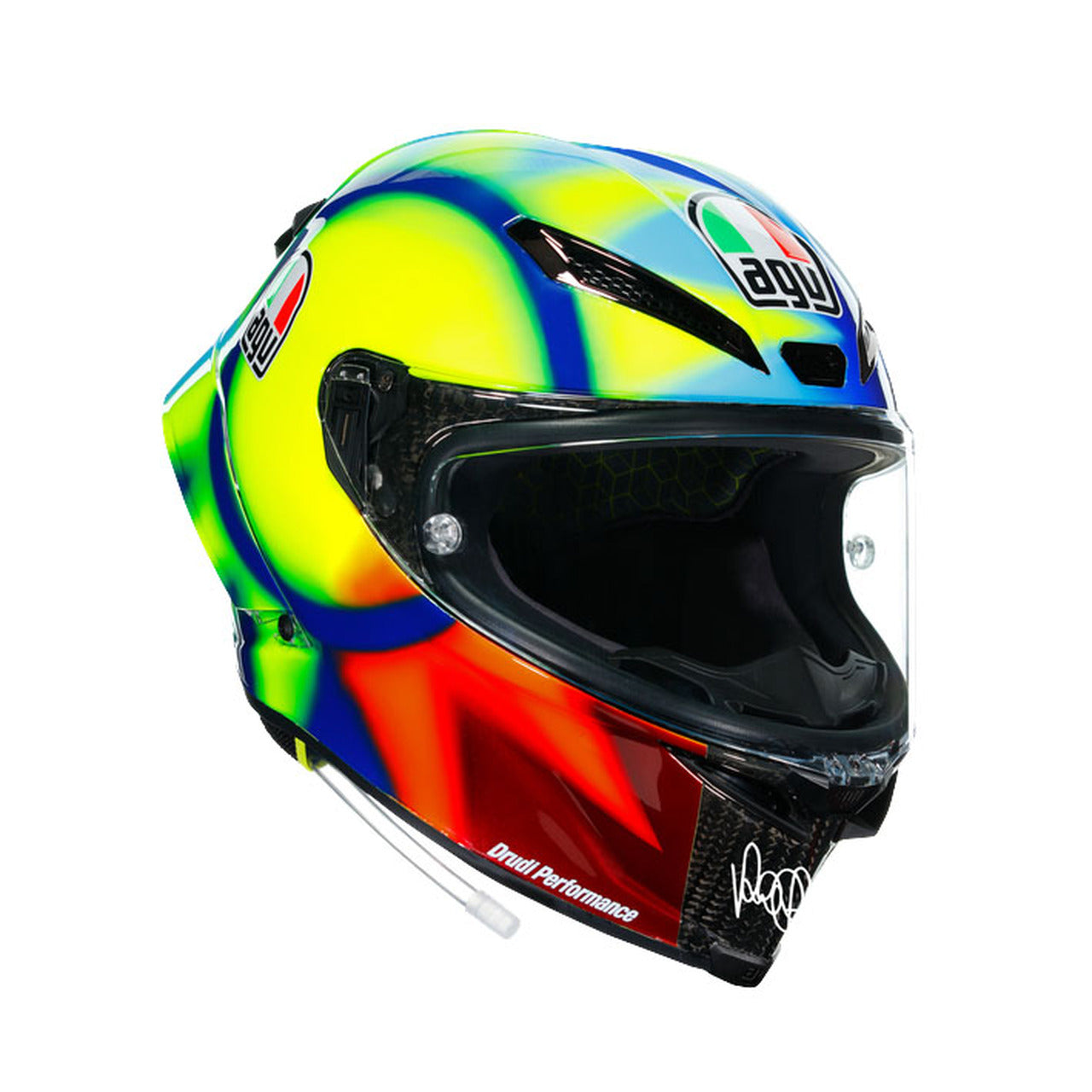 Pista GP RR is an exact replica of the AGV helmet used in races by professional world championship riders. It has therefore received FIM homologation, which certifies the highest possible level of protection, even against any dangerous twisting of the head. Every detail is designed to ensure ultimate performance. The Extreme Carbon shell in 100% carbon fiber guarantees extraordinary lightness, which makes it effortless to wear. Its shapes and metal air vents are studied in the wind tunnel and tested by AGV athletes in order to ensure the best aerodynamic penetration and the greatest stability at high speeds, also as a result of the innovative profile of the rear PRO Spoiler. Boasting up to 5 mm thickness, the optical class 1 Ultravision visor is an integral part of the protection that enables 190° panoramic vision. This means the rider sees the track, adversaries, and obstacles more clearly, before anyone else. The exclusive 360° Adaptive Fit system allows for complete customization of the interior, giving the rider the possibility to select the ideal thickness for the upper part of the head, nape, and cheeks. Essential comfort that allows the rider to concentrate on the goal without distractions.