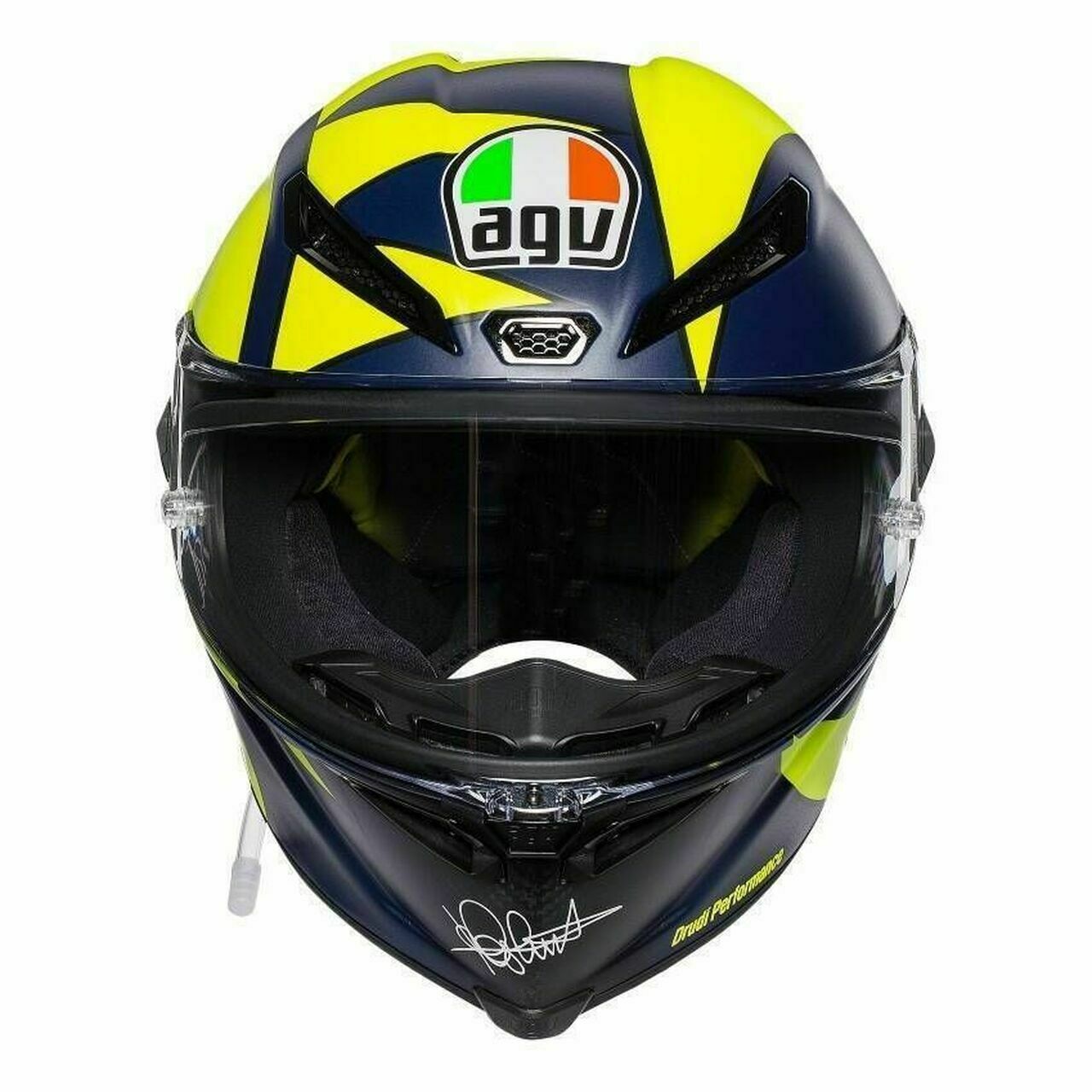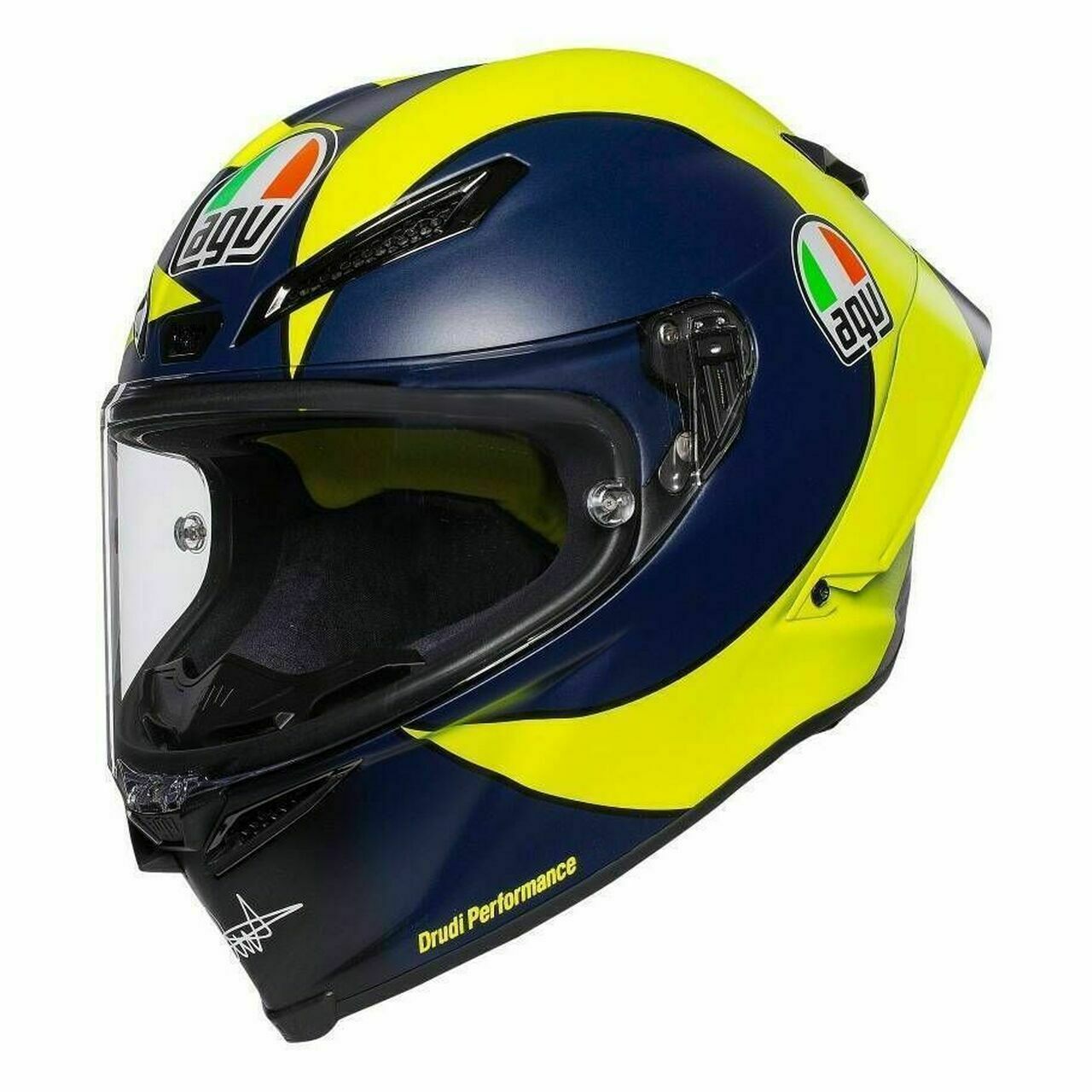 Pista GP RR is an exact replica of the AGV helmet used in races by professional world championship riders. It has therefore received FIM homologation, which certifies the highest possible level of protection, even against any dangerous twisting of the head. Every detail is designed to ensure ultimate performance. The Extreme Carbon shell in 100% carbon fiber guarantees extraordinary lightness, which makes it effortless to wear. Its shapes and metal air vents are studied in the wind tunnel and tested by AGV athletes in order to ensure the best aerodynamic penetration and the greatest stability at high speeds, also as a result of the innovative profile of the rear PRO Spoiler. Boasting up to 5 mm thickness, the optical class 1 Ultravision visor is an integral part of the protection that enables 190° panoramic vision. This means the rider sees the track, adversaries, and obstacles more clearly, before anyone else. The exclusive 360° Adaptive Fit system allows for complete customization of the interior, giving the rider the possibility to select the ideal thickness for the upper part of the head, nape, and cheeks. Essential comfort that allows the rider to concentrate on the goal without distractions.