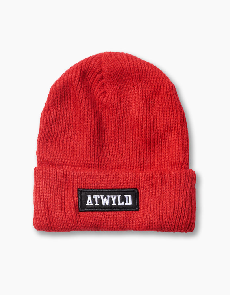 Super soft knit beanie in red with embroidered logo patch at center front.