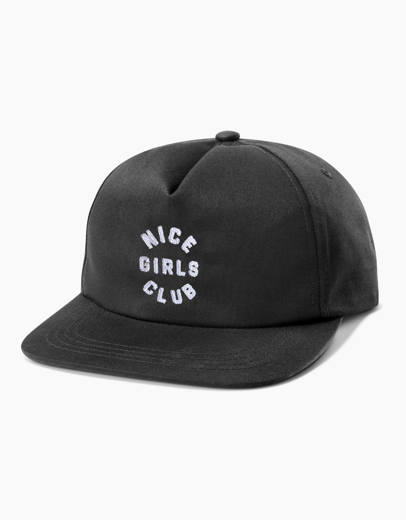Snapback black hat with a white chain stitch embroidery logo on the front. Join the club, be nice!