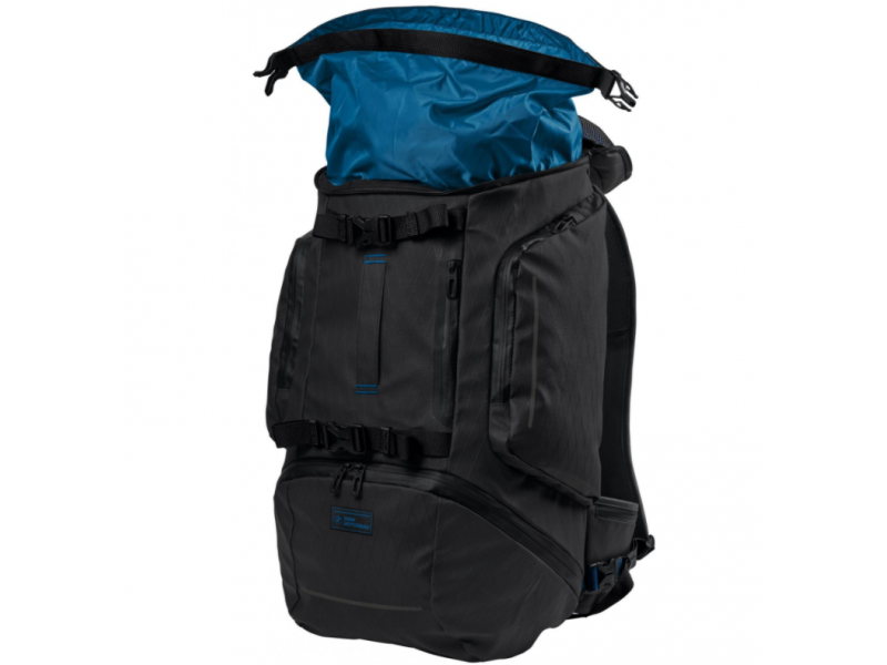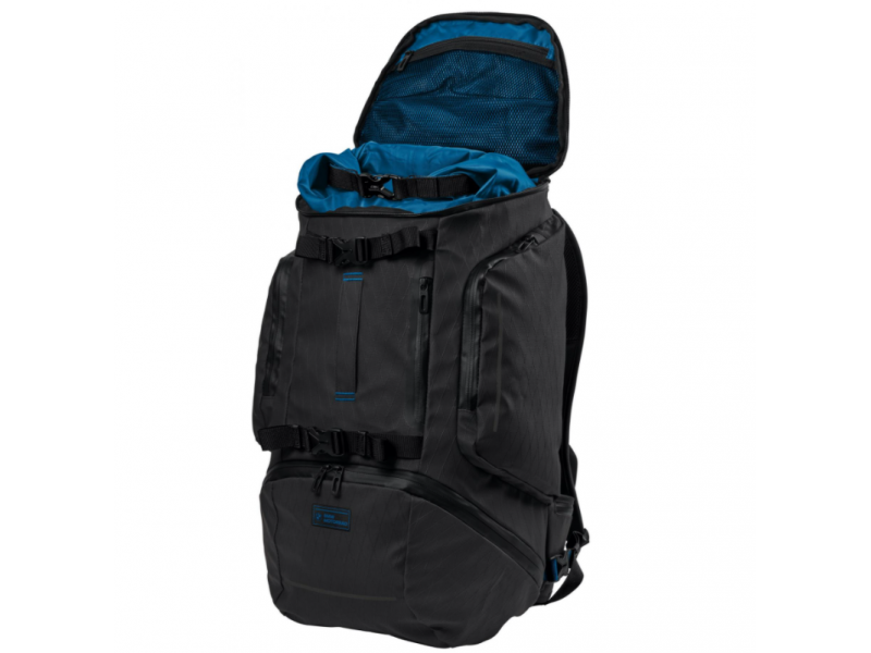 The high-quality and functional Black Collection, 30 L Backpack is ideal for longer tours with a little more luggage, thanks to its 25 litres of storage space which can be expanded up to 30 litres. The spacious main compartment is waterproof thanks to the roll closure and taped seams. The rubberised zips are also water-repellent. The main compartment with an integrated 15'' laptop compartment can be subdivided using an intermediate bottom. The lower section is separately accessible and can be extended to accommodate a helmet up to size 61. Additional storage space is provided by four splash-proof outer pockets and an inner mesh compartment in the top. Additional luggage can be attached to the outside using two fastening straps with buckles.