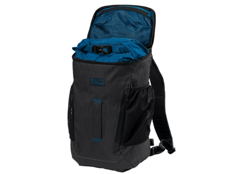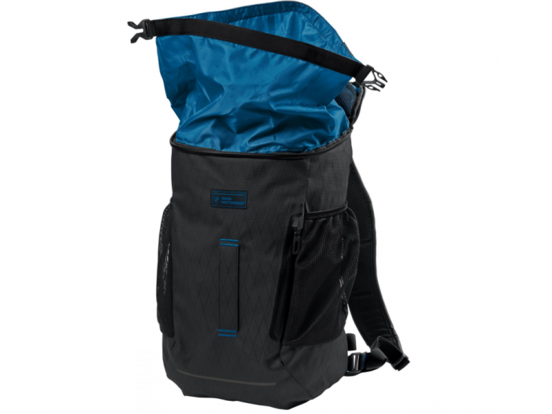 All four outer pockets, including one on the top, are splash-proof and feature rubberized zips. There is a practical mesh pocket inside the top. Thanks to its ergonomically shaped back section and its lightweight of 550g, the Black Collection backpack can also be worn comfortably for longer periods. Adjustable shoulder, chest and hip straps ensure an optimal fit. The Black Collection backpack is designed in black and features reflective material on the shoulder straps, top and front. BMW Motorrad lettering is also featured on the front. The inner lining is made of polyamide.