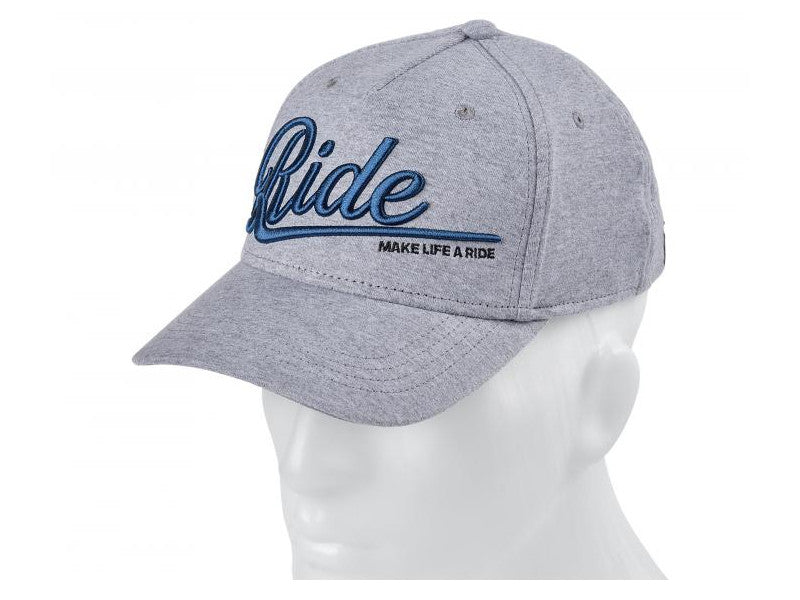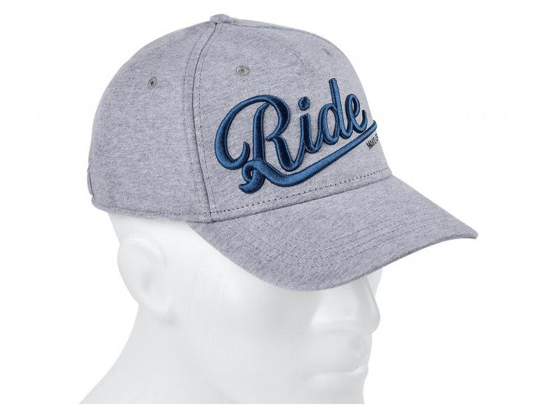 Grey baseball cap with raised embroidered "Ride" inscription at front.