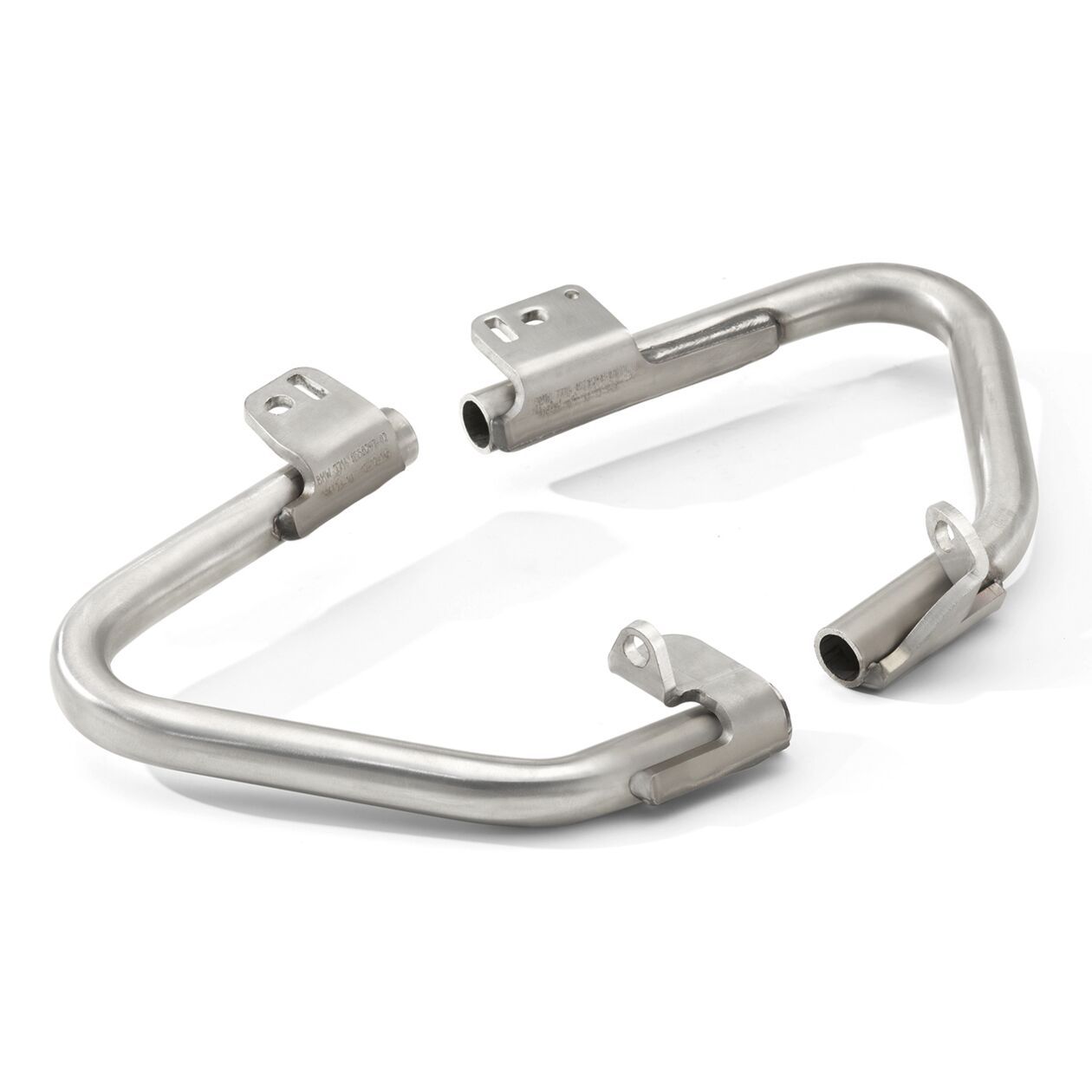 The electropolished stainless steel sturdy engine protection bar reliably protects the right engine housing against damage from the bike falling over or in the event of a fall without compromising the lean angle. It blends perfectly with the bike’s design.