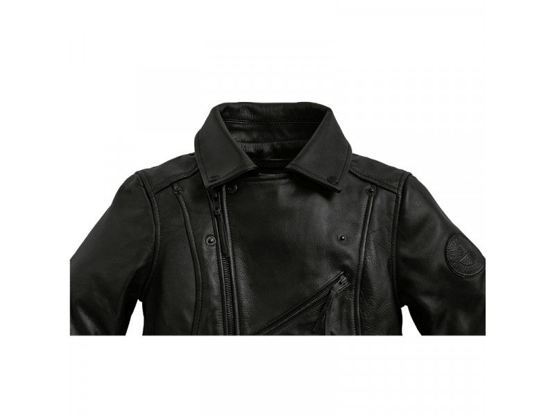 The FlatTwin leather jacket for ladies and men sports an off-centre front zip fastener and strikingly eye-catching lapels reminis-cent of motorcycling jackets typical of the 1950s. Three outside pockets with hallmark metal zip fasteners and the small pocket on the lower-arm sleeve round off the classic styling.