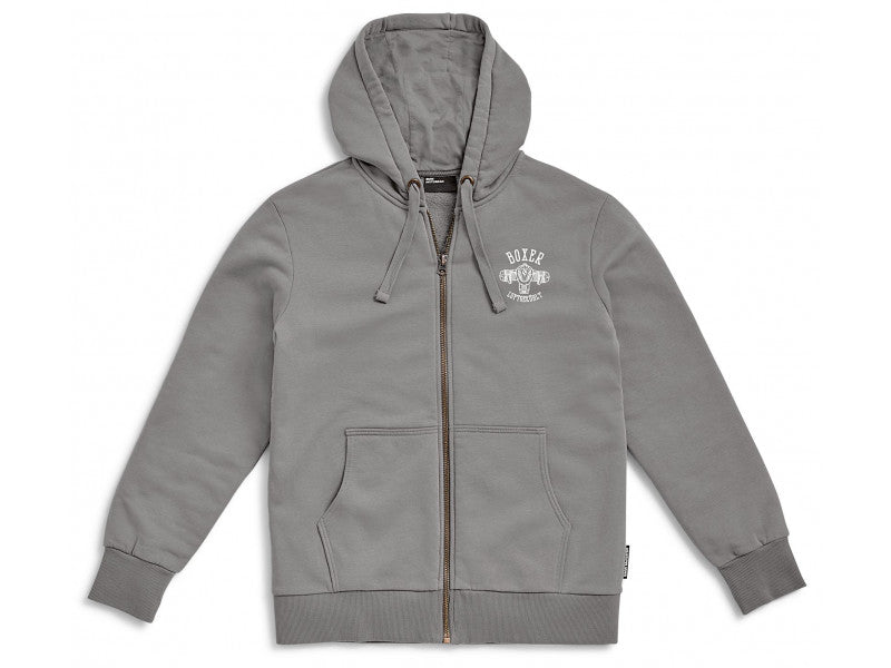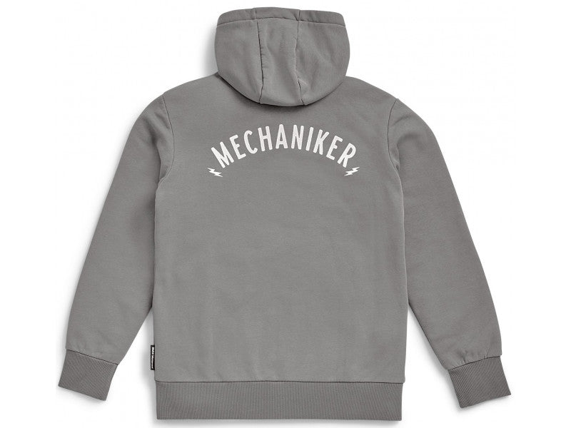 On chilly days the Mechaniker zippered hoodie keeps the wearer snugly warm, and the low-set pockets are just right for warm-ing up cold hands. The highly versatile hoodie for ladies and men is made of cotton jersey. The inside is roughened and the hood-ie boasts a print of an opposed-twin engine on the chest, with the German word "Mechaniker" on the men's version or "Mechan-ikerin" on the ladies' version, on the back.