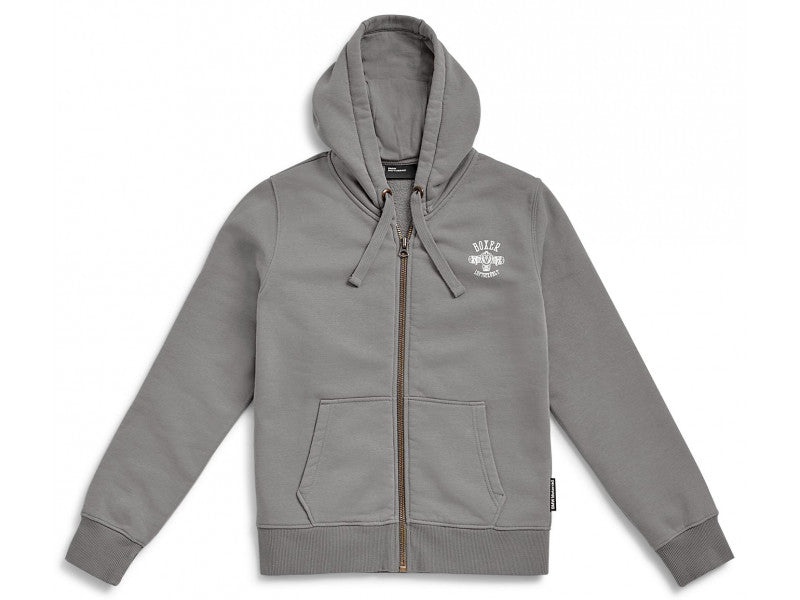 On chilly days the Mechaniker zippered hoodie keeps the wearer snugly warm, and the low-set pockets are just right for warm-ing up cold hands. The highly versatile hoodie for ladies and men is made of cotton jersey. The inside is roughened and the hood-ie boasts a print of an opposed-twin engine on the chest, with the German word "Mechaniker" on the men's version or "Mechan-ikerin" on the ladies' version, on the back.