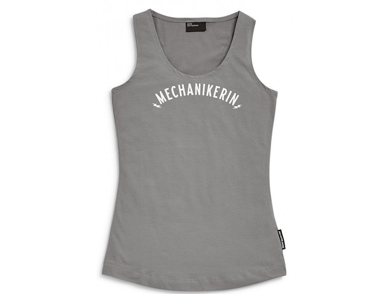 The grey Mechanikerin tank top for female BMW Motorrad fans is 95 % cotton with 5 % elastan in the blend. The slight waisting, the slim fit and the striking motif add that little something extra.