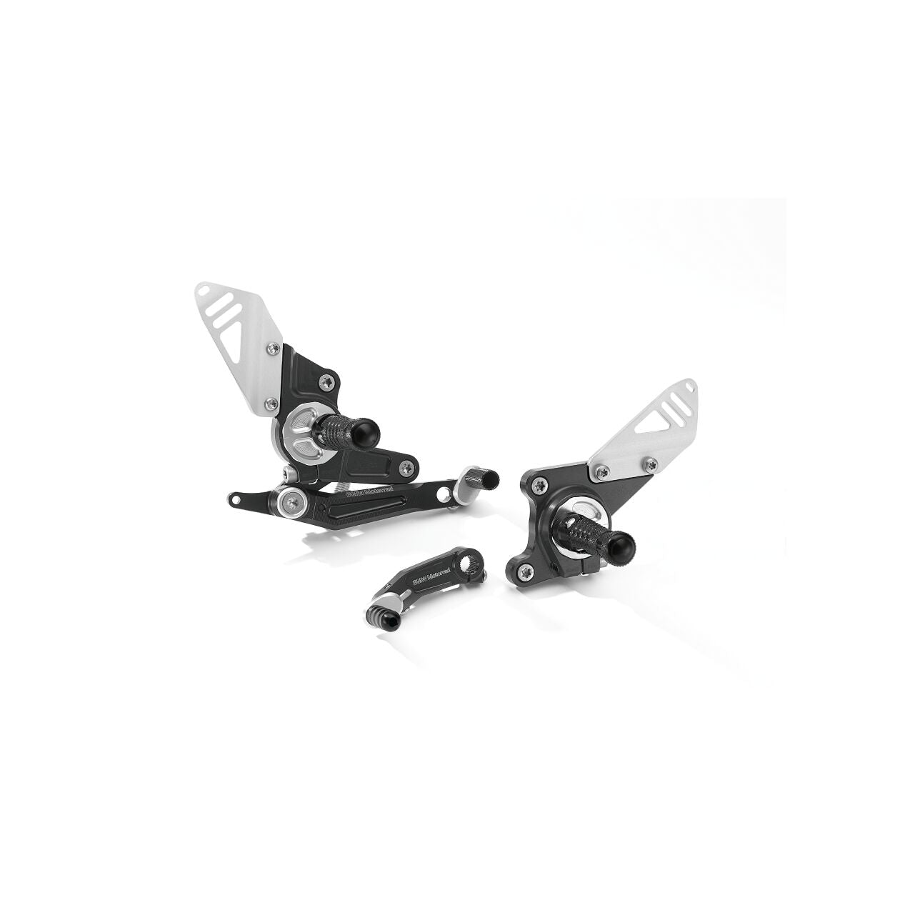 The CNC-milled footrest system on the left enhances the dynamic look of the motorcycle. The ribbed footboard provides a secure base for the rider’s feet, ensuring optimum control of the bike. Numerous adjustment options meet a rider's every wish when it comes to ergonomics and sporty character.