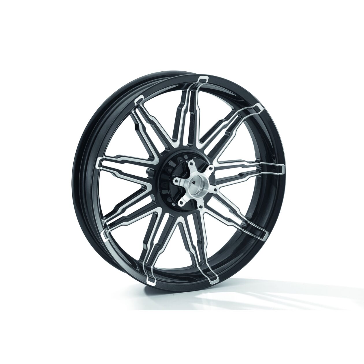 The high-quality Classic forged wheel of the exclusive Option 719 presents itself in an elegant two-colour look with all-round gloss milling. The special surface treatment with detailed milling contours and the nine-spoke design give the touring bikes a soft and particularly valuable appearance.