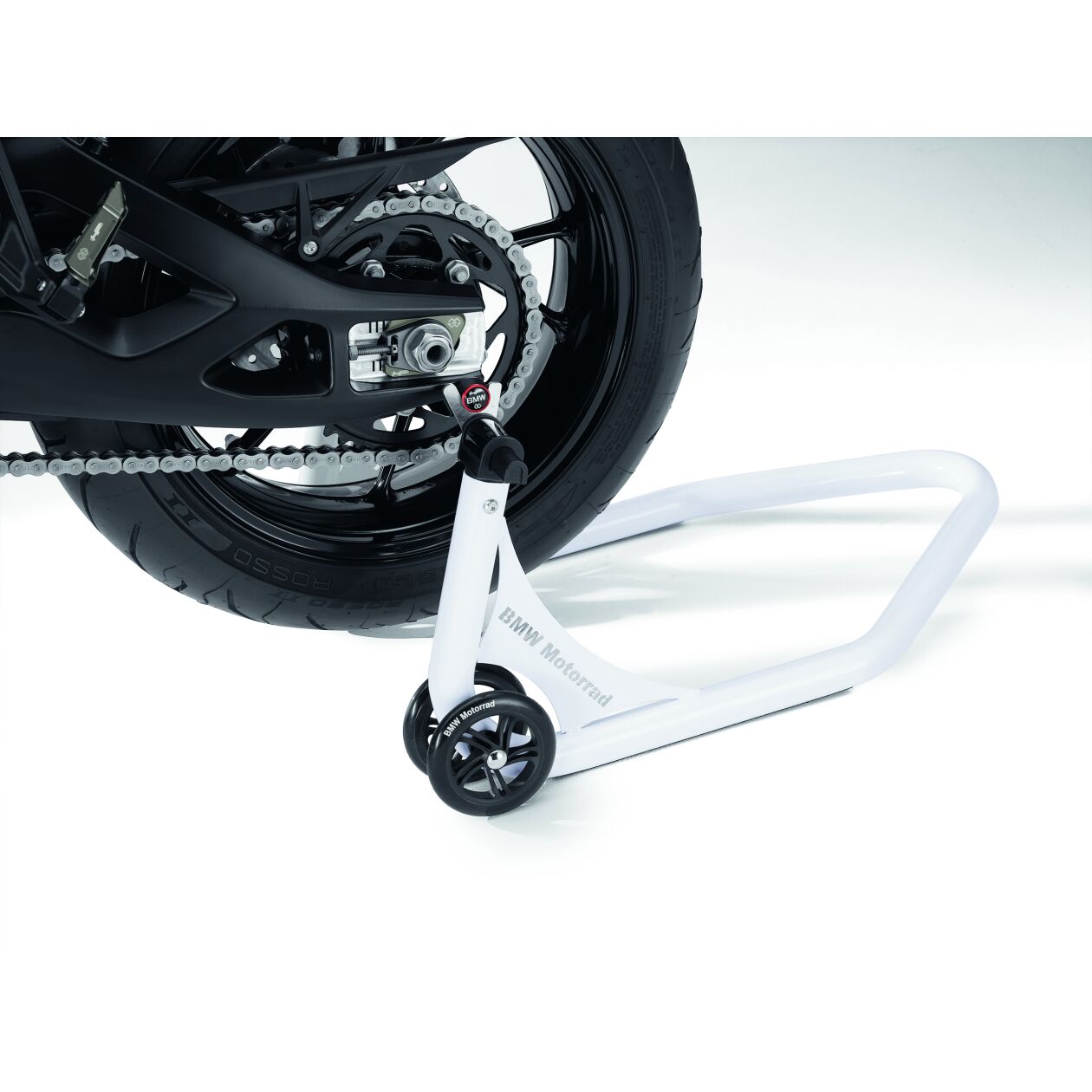 The motorcycle’s rear wheel can be easily jacked up using the Sport auxiliary stand. The stand ensures a safe standing position. It is extremely stable and has a higher material thickness than conventional auxiliary stands. The double castors facilitate jacking up and are particularly durable.