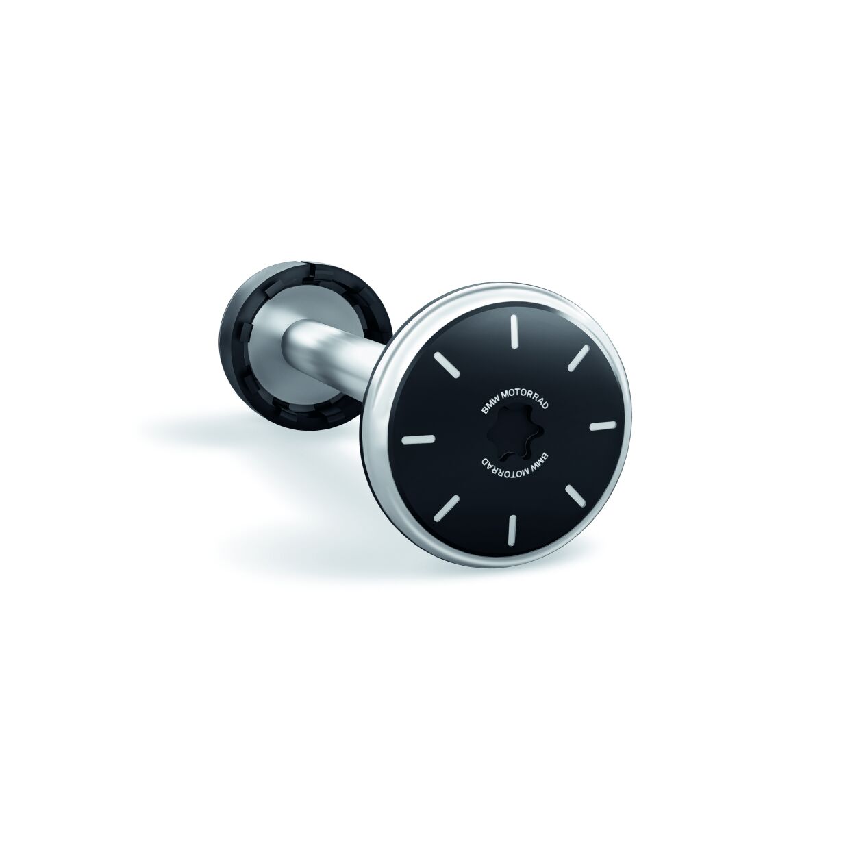 The milled aluminium rear-wheel cover emphasises the dynamic design of the bike. The black anodised covers with BMW Motorrad inscription and a diameter of 62 mm enhance the motorcycle visually and technically.