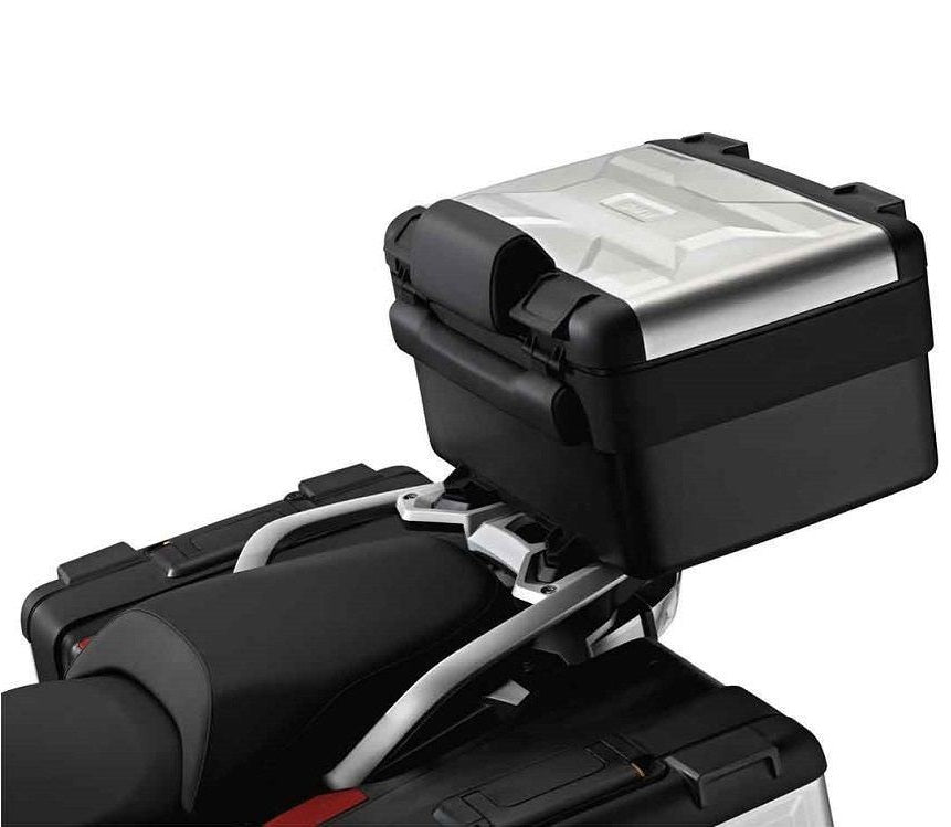 The waterproof variable top box can be mounted onto the standard luggage grid using the adapter plate. Alternatively, it can be fitted in conjunction with the optional luggage grid to replace the pillion passenger seat. As with the variable panniers, the capacity is adjustable, and can be expanded from 25 l to 35 l quickly and easily by moving a bar inside. An optional backrest pad provides increased comfort for the pillion passenger.