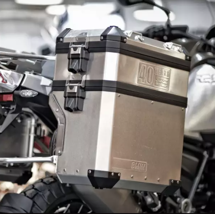 The aluminum case volume expansion set for the 40 Years GS Limited Edition expands the volume of the cases by 13.5 liters of luggage volume on each side to a total of 27 liters of additional volume. It is inserted between the body and lid of the case and is safely attached to the case by the BMW locking system and does not affect the tight sealing. The volume expansion, which has a weight of just 1.6 kg, can be installed and removed without any difficulty, and the cases can be opened easily as usual.