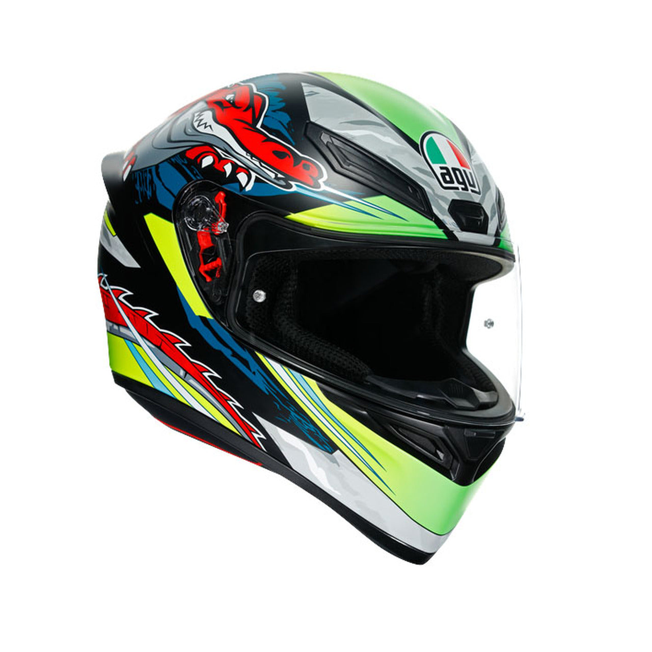 Aerodynamic shape, racing-developed front air vents and wind-tunnel engineered aero spoiler maximize performances while providing stability at higher speed. Panoramic anti-scratch visor allows a wider lateral and vertical field of vision for a total control of the environment. Comfort is no-compromise with Dry-Comfort soft removable interiors.