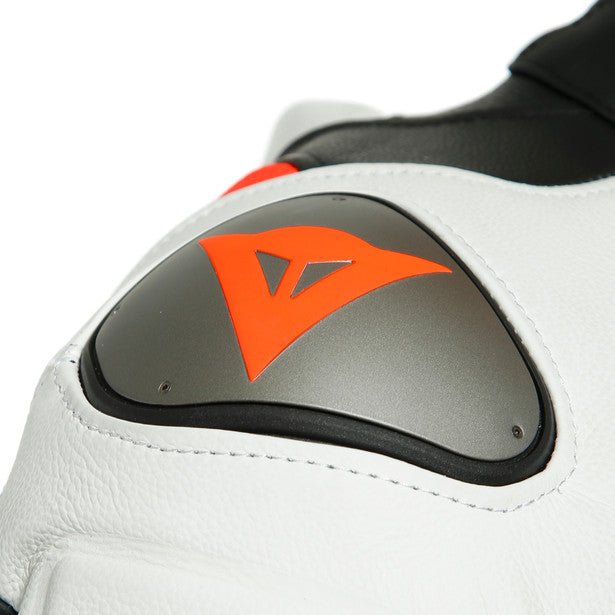 Its structure was conceived to give maximum freedom of movement on the saddle. Its superior ergonomics ensure the highest level of safety: exclusive Dainese Tri-Axial system on the back and three-way stretch leather inserts allow for perfect mobility while guaranteeing the same level of abrasion resistance as the other leather layers. Inserts in XF Arrow, the cutting-edge Dainese material blending great elasticity and wearability with the resistance of leather, for enhanced mobility.