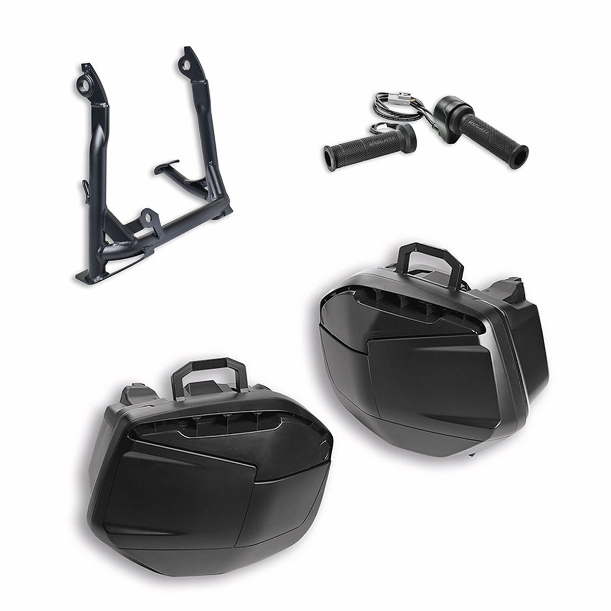 For a touring version of the bike. The kit contains a set of side panniers, a centre stand and heated handgrips.