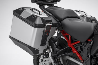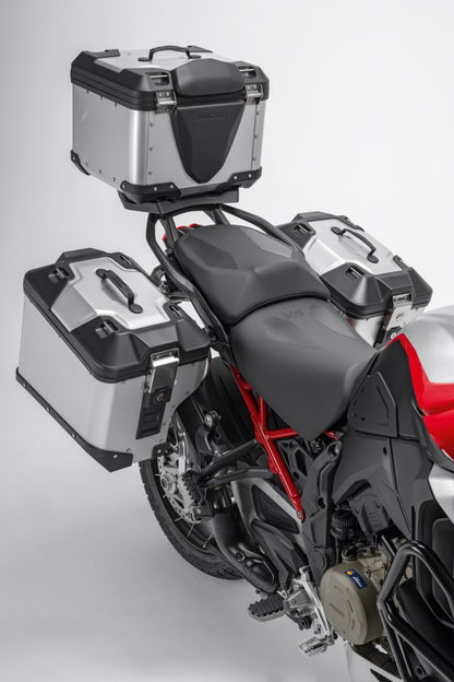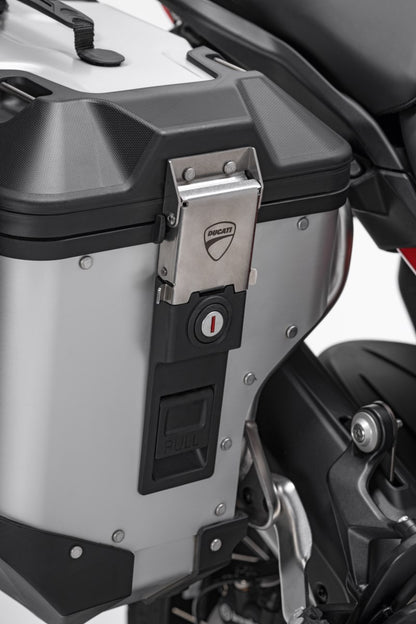 An elegantly designed strong accessory representing the perfect combination of functionality and style. Made from aluminium, they maintain the natural colour over time thanks to high-quality anodising. The significant total capacity of 76 litres will allow you to bring all you need for the journey, without affecting motorbike's handling. An element of great style, perfect to make every adventure on the Multistrada unforgettable.