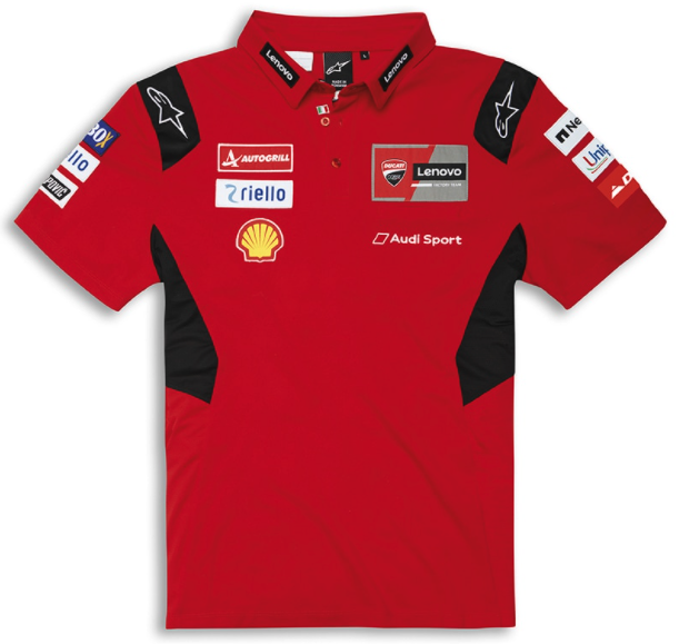 Enjoy all the thrill of MotoGp with a short-sleeved polo shirt, by Alpinestars, that faithfully reproduces the design of the official Ducati team. Bright racing red together with the sponsor and Corse team patches. The embroidered and printed details give the garment a touch of refinement, making it perfect for the excitement of the grandstands of a race circuit or to unleash all your Ducati passion in your free time.