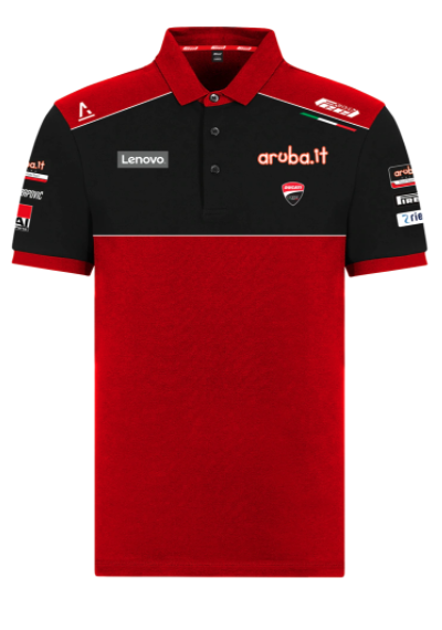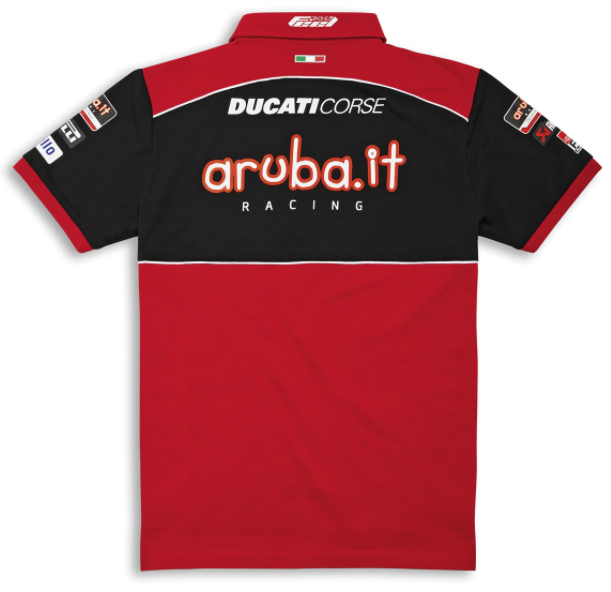 Exclusive short-sleeved polo shirt that faithfully reproduces the design of that used by the official Aruba.it Racing - Ducati team in the World Superbike Championship. Iconic red and black design, with patches, embroideries and prints from the sponsors and the Corse team. Garment with an aggressive and distinctly sporty look, to support the official Panigale V4 R team from the grandstands of a race circuit and enjoy all the emotions of Superbike as a true connoisseur.