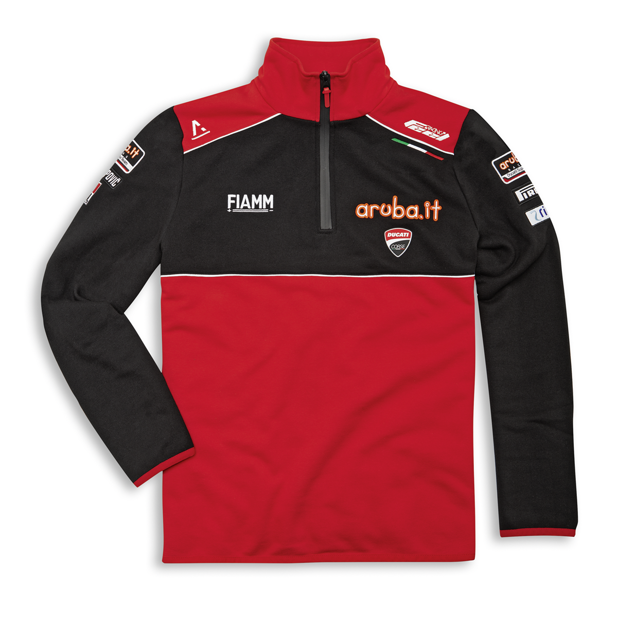 Exclusive sweatshirt that faithfully reproduces the design of that used by the official Aruba.it Racing - Ducati team in the World Superbike Championship. Iconic red and black design, with patches, embroideries and prints from the sponsors and the Corse team. Garment with an aggressive and distinctly sporty look, to support the official Panigale V4 R team from the grandstands of a race circuit and enjoy all the emotions of Superbike as a true connoisseur.