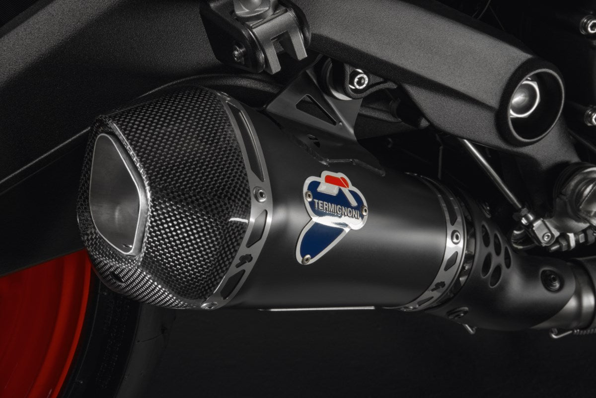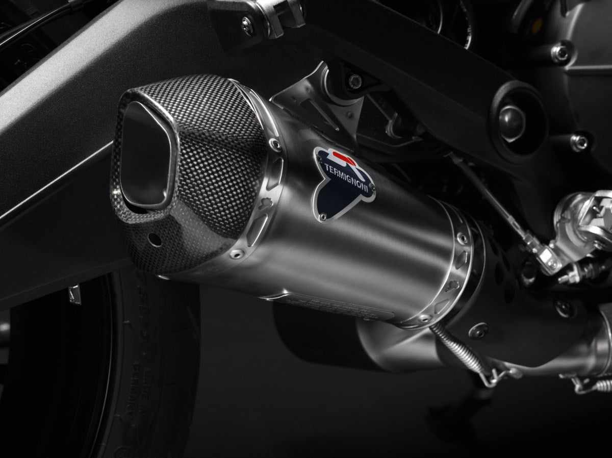 Thrilling sound with removable db-killer and full power delivery thanks to the dedicated mapping. This steel silencer by Termignoni, with its dedicated mapping, makes for an exciting ride right from the word go, also adding a touch of style thanks to the chance to choose the sleeve that suits your bike best.