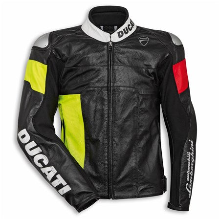 Designed by the Ducati Style Center, this garment is inspired by the graphics of the Ducati Streetfighter V4 Lamborghini, making it highly iconic. The soft D-Skin 2.0 leather exterior, provides high abrasion and tear resistance. Furthermore, the S1 fabric zones on the armholes and micro-elastics on the back provide a sensational fit. These details match with the strategically-placed perforation (in the summer version) and the adjustable waist, which offers riders excellent riding comfort and sensitivity. It also features two inner pockets and two outer pockets to ensure maximum practicality. The fixed lining features a fine construction; breathable and hypoallergenic, it is made of Nanofeel® and 3D bubble to ensure a steady temperature. The CE-certified jacket provides higher protection where you need it the most, thanks to interchangeable aluminum plates inserted in the shoulders and composite protectors in the elbows. Outstanding protection in case of a fall, ensured by the possibility to add a back protector. This item is available only in the men’s fit, both in the standard and perforated version. Each jacket is custom made according to the customer's size requirements.