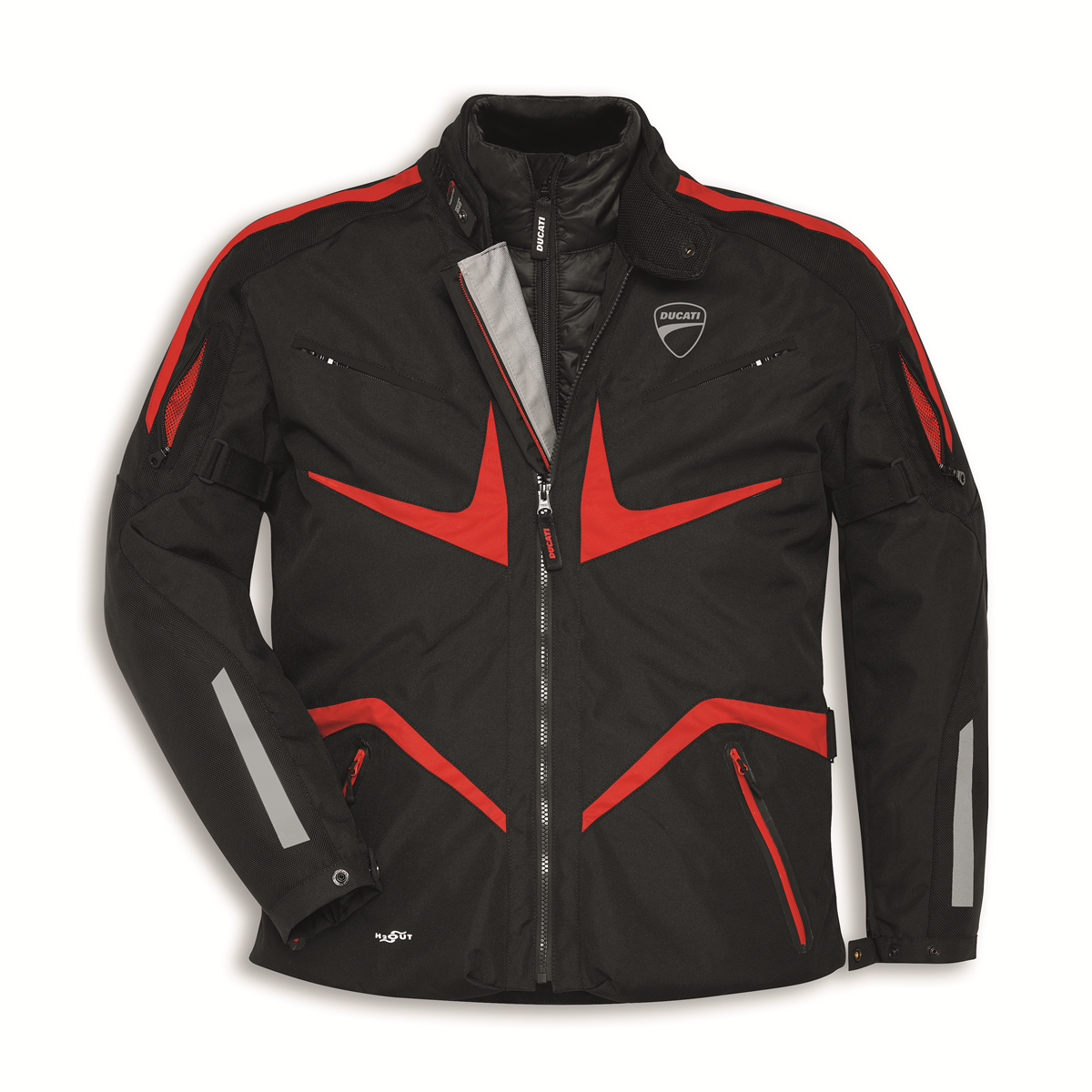 The Tour V2 jacket for sport touring is designed by Aldo Drudi and made in collaboration with Spidi. Equipped with CE-certified shoulder and elbow protectors, and ready for the insertion of a Warrior 2 back protector, the jacket’s outer layer is a mix of polyester fabrics of varying weights and an internal thermal lining that can be removed and worn like a casual down jacket. The external layer has an impermeable, breathable, and wind-resistant H2Out® membrane. Designed to be worn with Tour V2 trousers, the jacket is available in a men’s cut in black/red and high-visibility yellow/black, and for women in black/red.