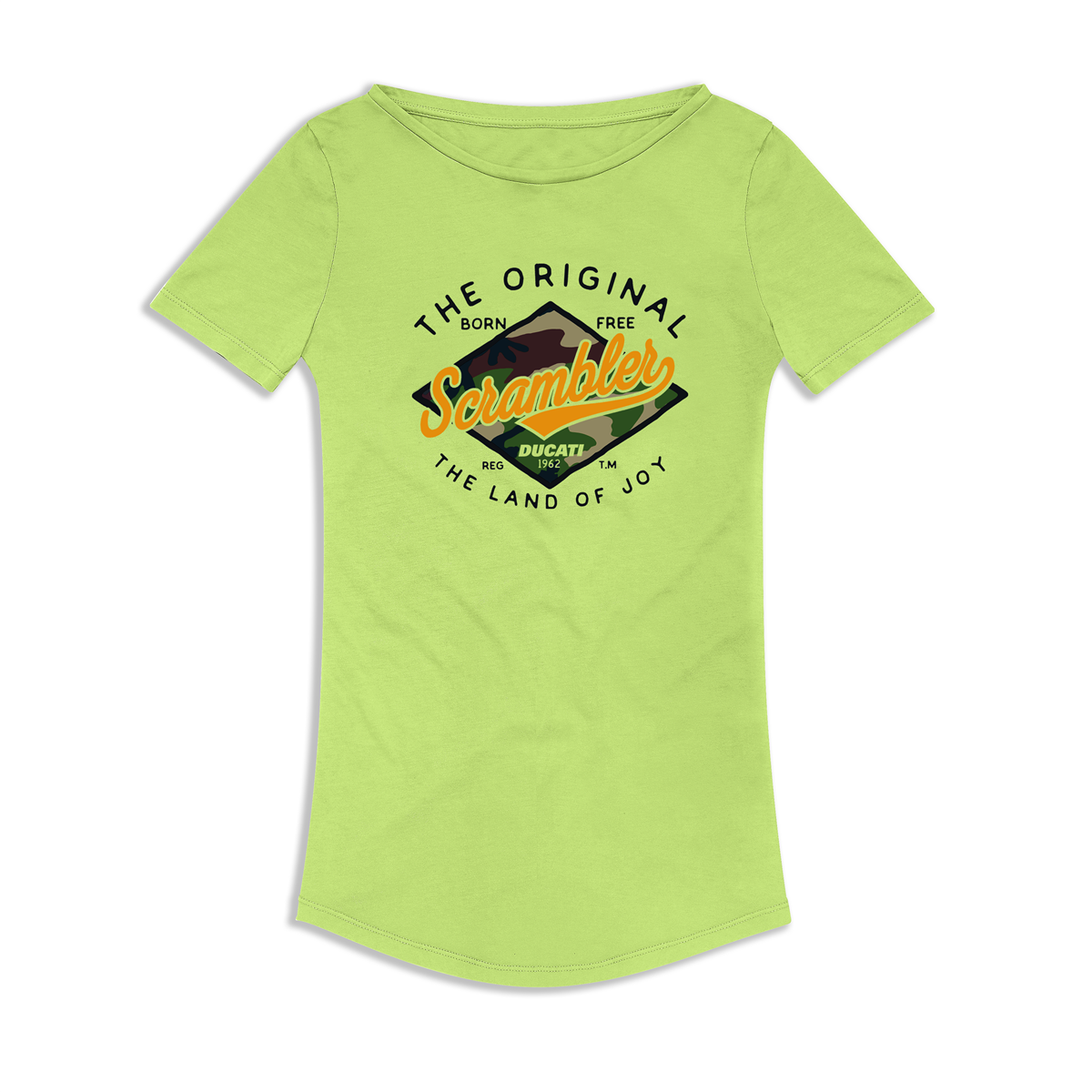 The sage green, camouflage graphic t-shirt resonates with the Scrambler DNA. Watercolor print for a supple, impalpable and understated effect. Garment dyed to show off color highlights on stitching and thicker areas. A glamorous T-shirt glaring with feminine style.