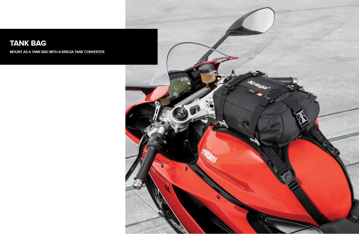 - Use as a tank bag, with the addition of a Kriega TANK Converter. (sold separately)