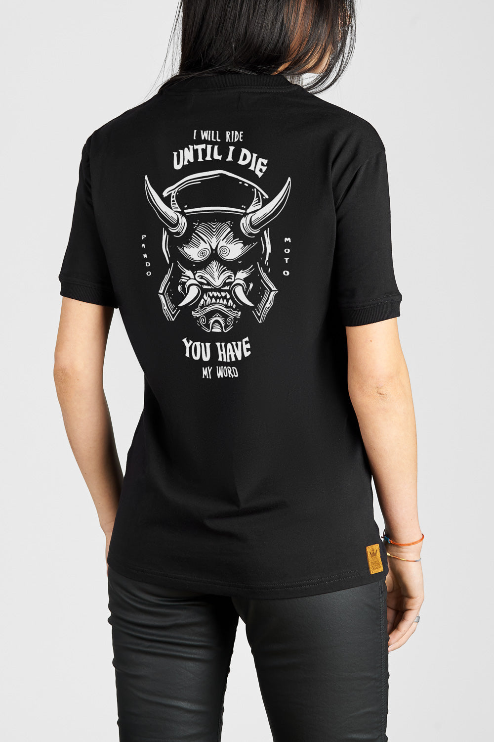 A timeless t-shirt that represents Pandomoto’s vision and commitment to excellence. Simple designs meet high-quality fabric to give you maximum comfort on and off the saddle. High-grade ECO 5.3oz cotton fabric makes this t-shirt a great ally during the hot season – MIKE TILL DIE 1 is something that can’t miss in your summer wardrobe. Tune in to your body and listen to the rider inside you. Featuring Pandomoto’s logo at the front, white on black large print at the back, and ribs on sleeves.