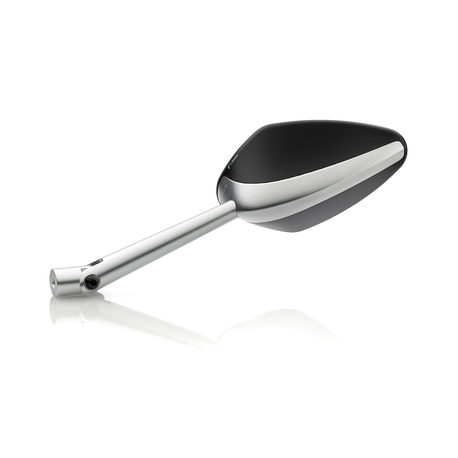 The Veloce mirror exclusively combines two different materials. Billet aluminum body (obtained by 3D precision machining) and an aeroDynamic polymer shell. Besides making it more eye-catching, the use of two different materials makes it lighter. AeroDynamic shaping helps prevent turbulence at speed. A large reflective surface area, which complies with European homologation standards, ensures, along with the adjustment system and convex anti-dazzle glass, an optimal field of view. Alluring design adapts perfectly to even the most captivating naked models.