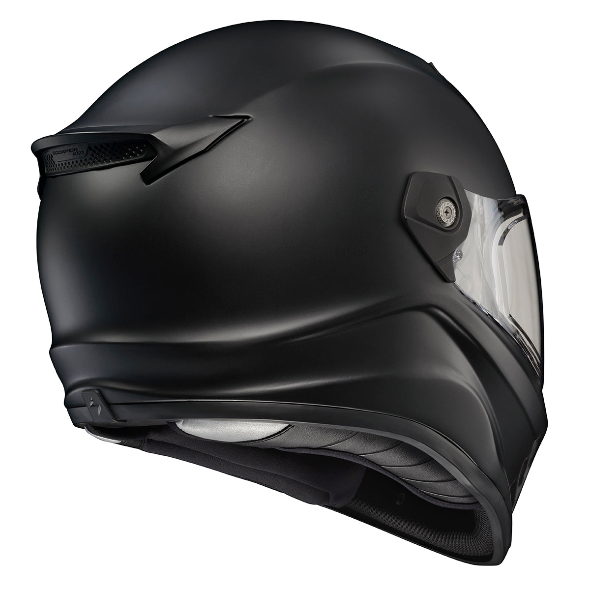 - Scorpion EXO’s face shield ratchet system pulls the shield securely against the eye port, ensuring a proper seal